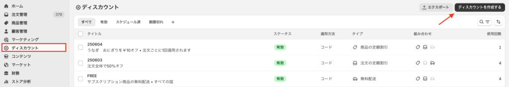 ②Shopify「ディスカウント(クーポンコード)」の設定