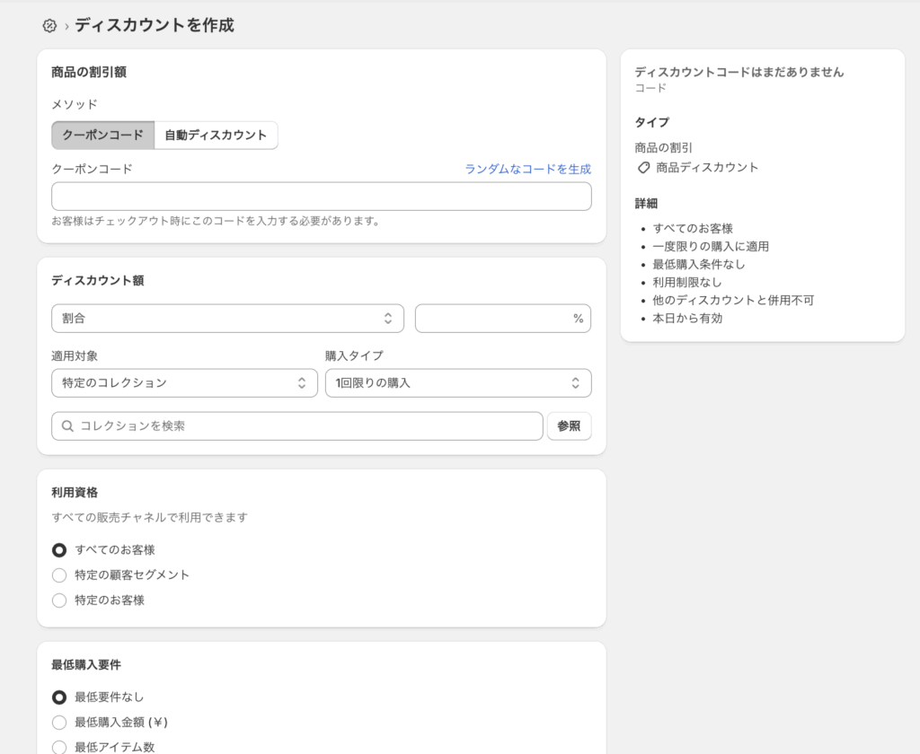 - 「割合」「定額」などの設定や、クーポン適用を許可する商品ラインナップやコレクションの選択が可能です