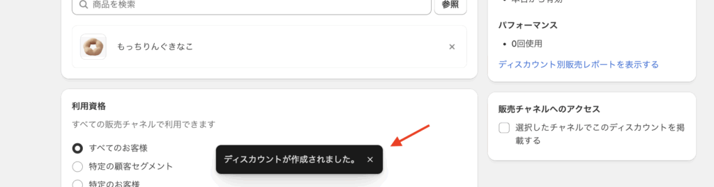 保存後、「ディスカウントが作成されました。」というメッセージが表示されます。