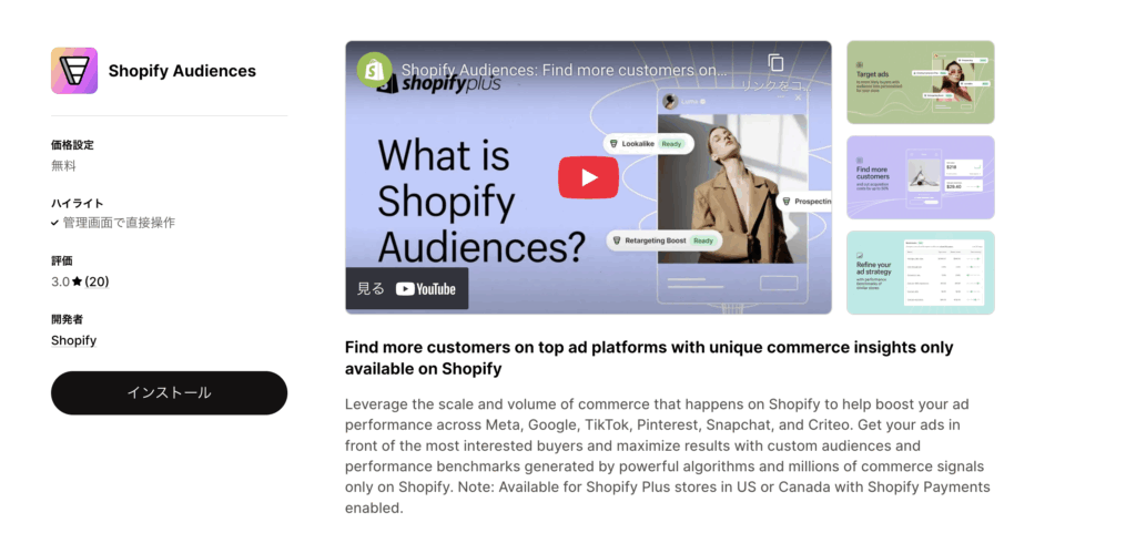 Shopify Audiencesは、Shopifyペイメントを使用し、アメリカまたはカナダに拠点を置く、Shopify Plusに加入している資格を満たしたストアのみが利用できます。