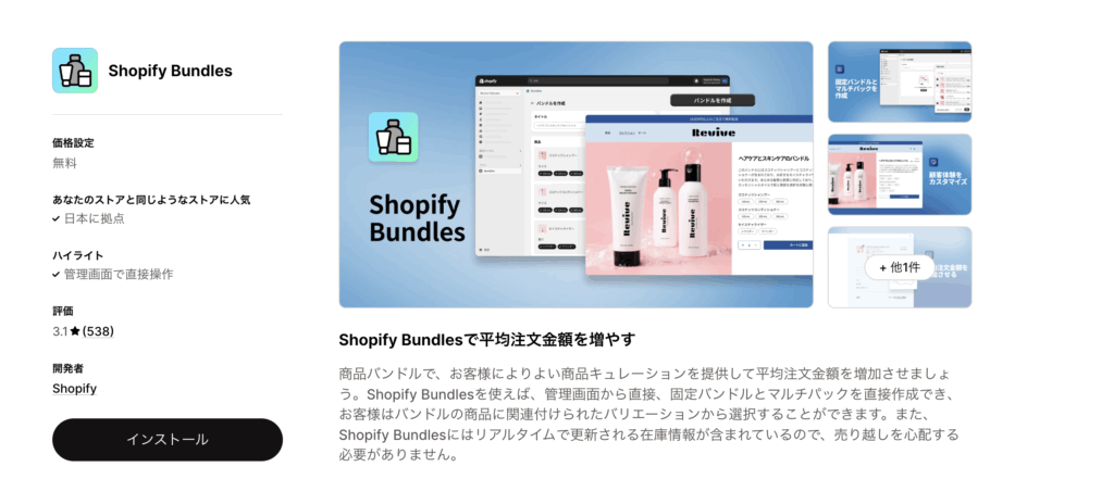 Shopify Bundlesは、関連商品をまとめて提供できるバンドル販売アプリで、平均注文金額の向上に役立ちます。