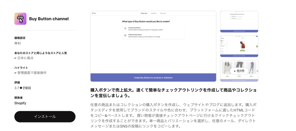 Buy Button channelは、任意の商品やコレクションに購入ボタンを作成し、ウェブサイトやブログ、メールやSNS投稿に追加することで、簡単に売上を拡大できるアプリです。