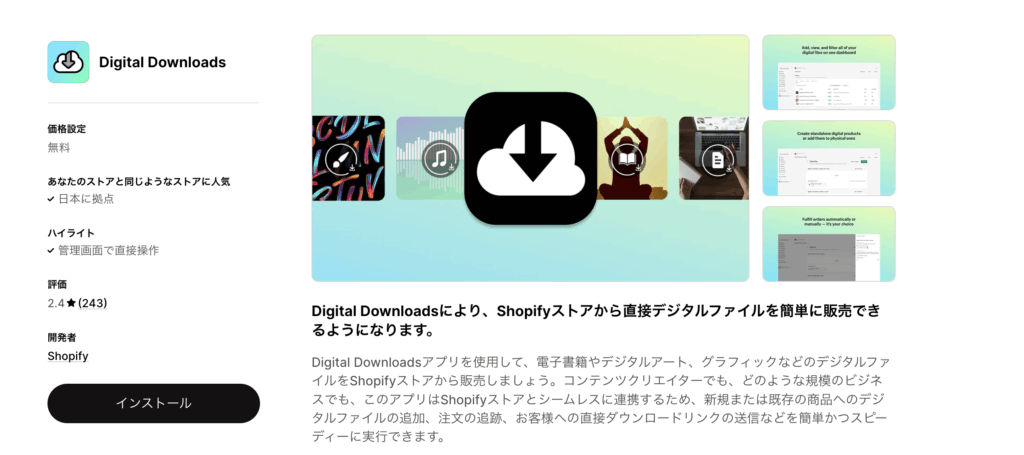 Digital Downloadsは、Shopifyストアから電子書籍やデジタルアート、グラフィックなどのファイルを簡単に販売できるアプリです。