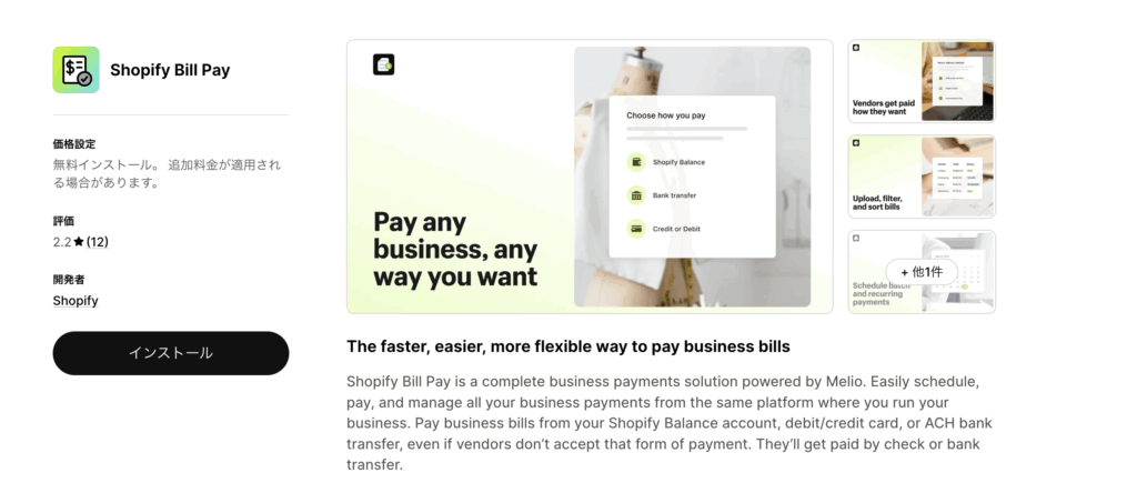 Shopify Bill Payは、Melioが提供するShopify統合型のビジネス支払いソリューションで、請求書の管理と支払いをより簡単に、柔軟に行えます。