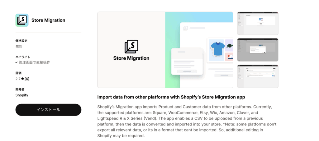 Shopify Store Migrationアプリは、他のプラットフォームから商品や顧客データを簡単にインポートできるツールです。