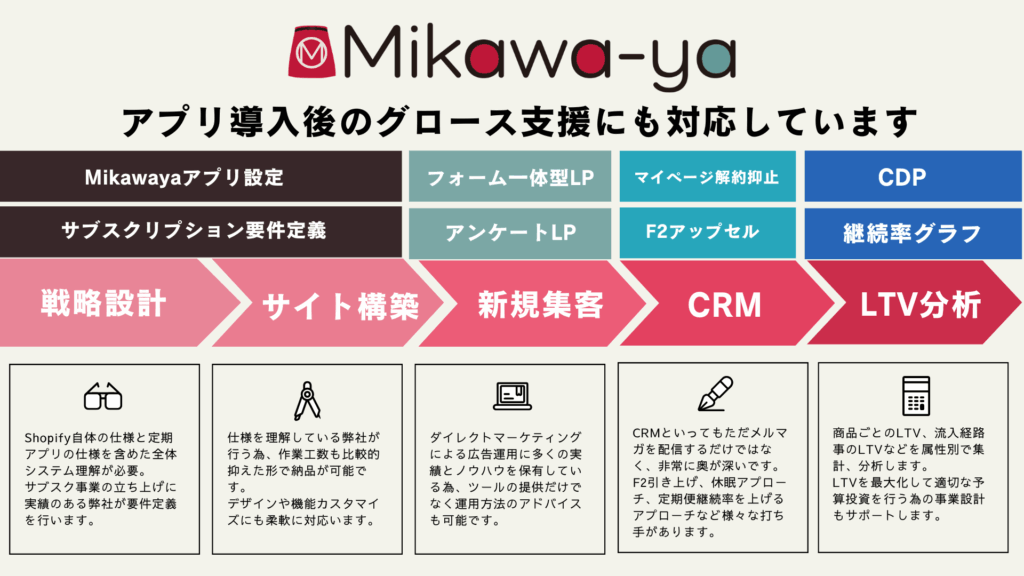 Shopifyサブスク運営に必要な機能はもちろん、マーケティングやLTV分析に役立つ機能なども充実していますので、気になった方は是非アプリをインストールしてお試しください!